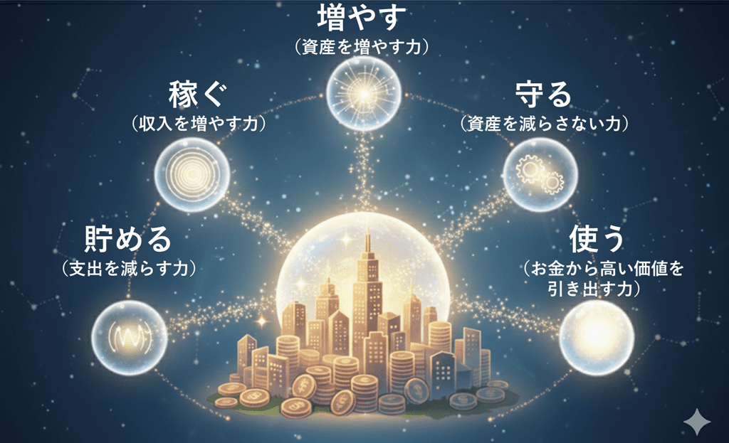 本書の大きな特徴は、「貯める」「稼ぐ」「増やす」「守る」「使う」という 5つの力 をバランスよく身につける方法を紹介しています。
